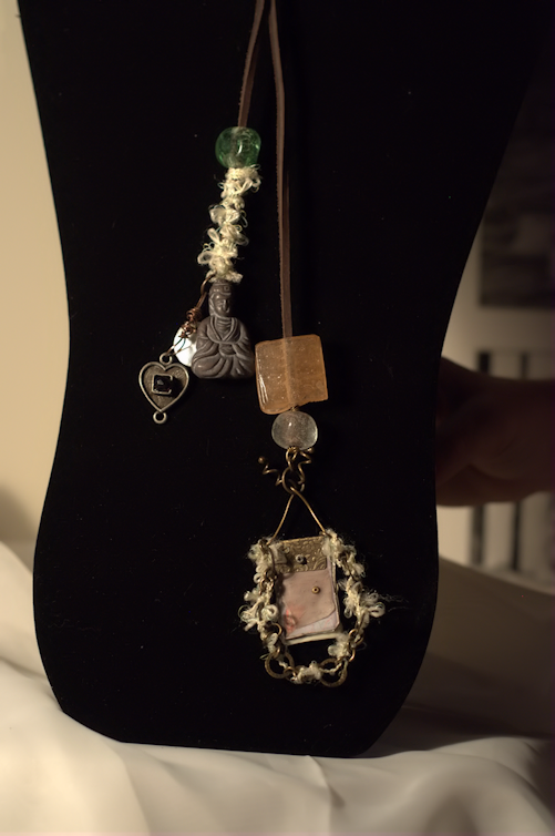 One side features a large charm with a chain that frames it; the chain has sea green ribbon wound through it and topped with two glass beads. The other side of the lariat features several charms including a meditative piece, a metal heart, and a seashell; the wire wrapping on this side is covered with sea green ribbon and topped with a green glass bead.