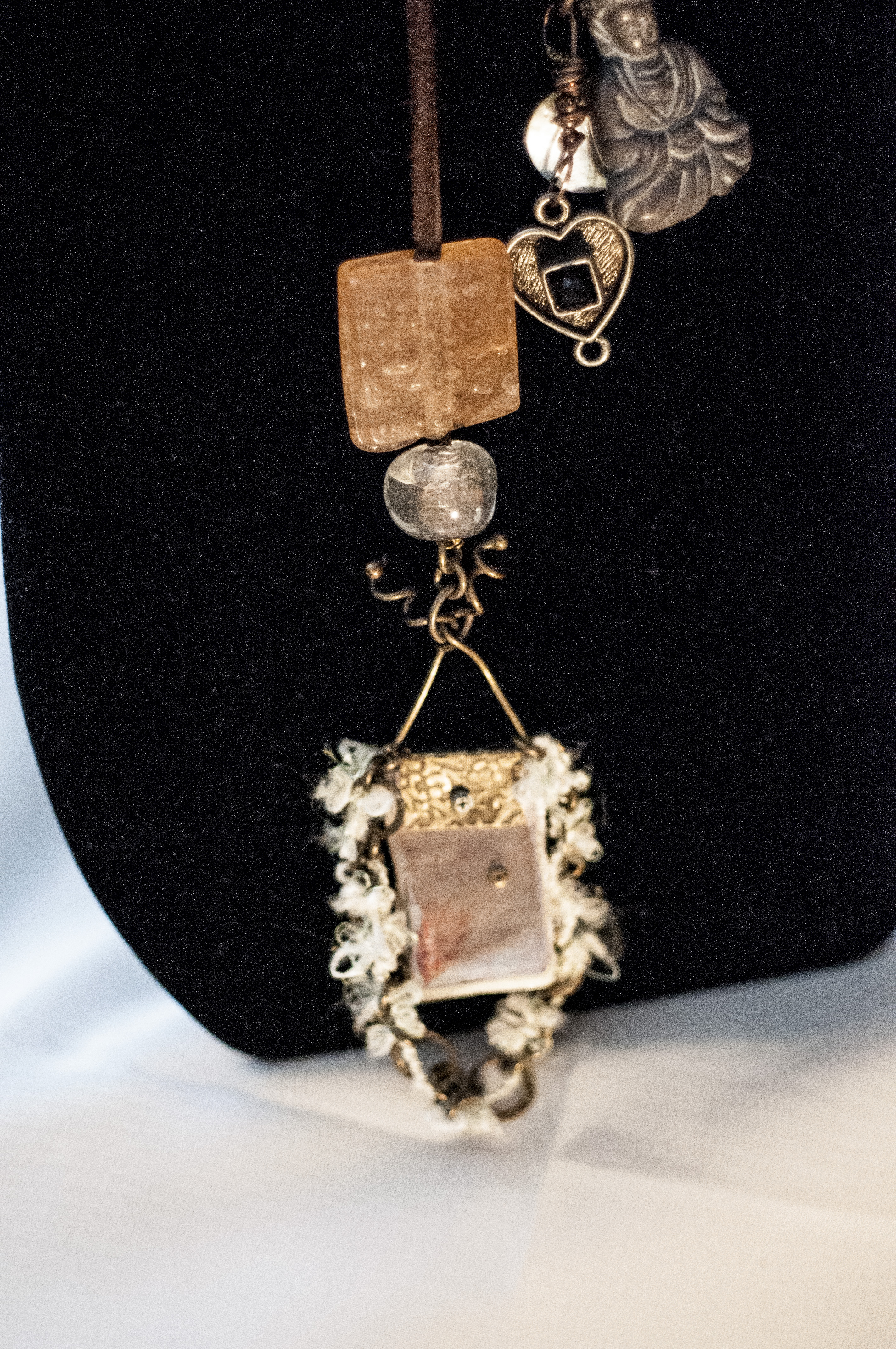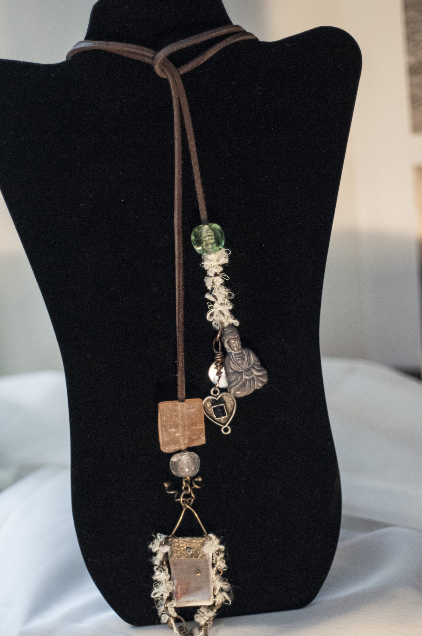 This brown leather lariat can be worn in a variety of ways encircling the neck. The lariat is adorned with charms that have been wrapped with wire around each end, and glass beads cover the wire wrapping.